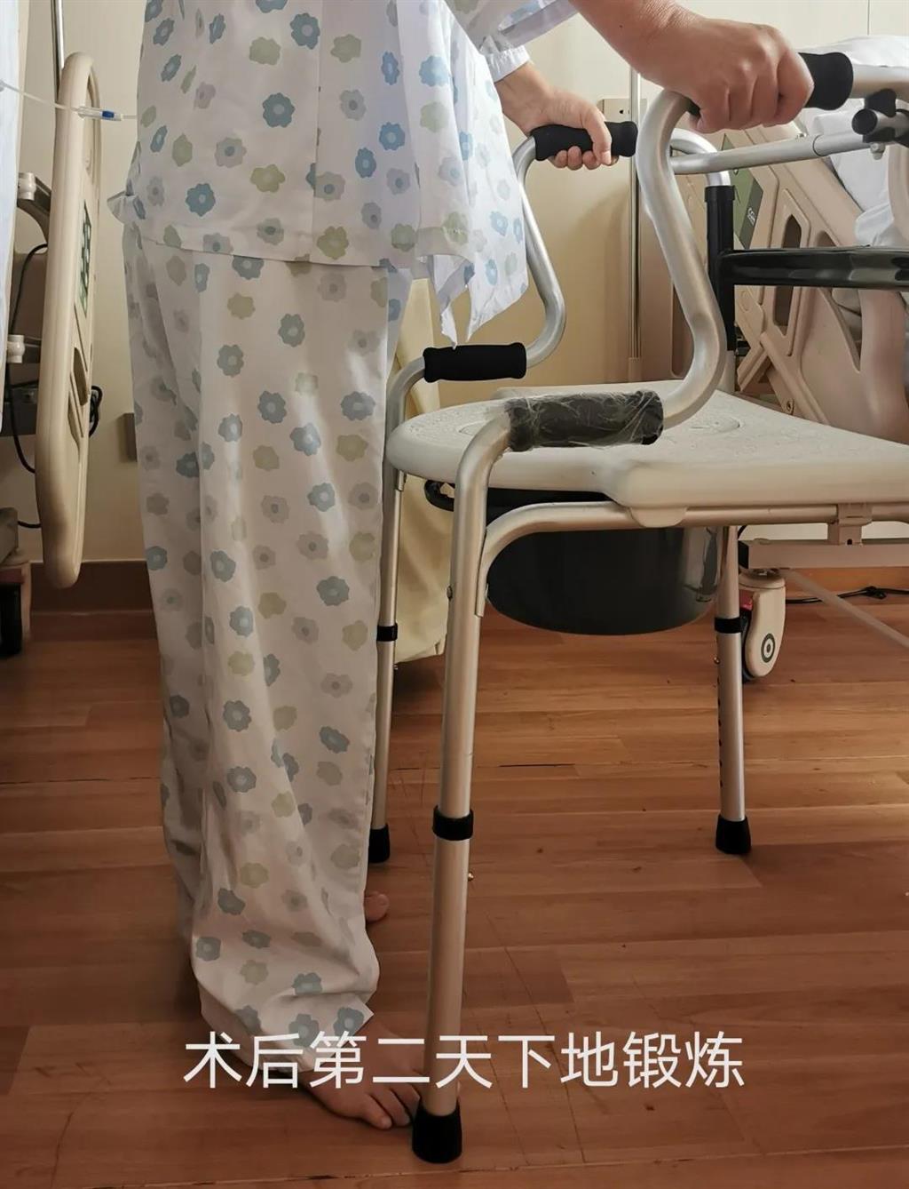 手術(shù)很成功!李女士術(shù)后第二天便可下地進(jìn)行簡(jiǎn)單的鍛煉了。 (△李女士術(shù)后第二天下床鍛煉)