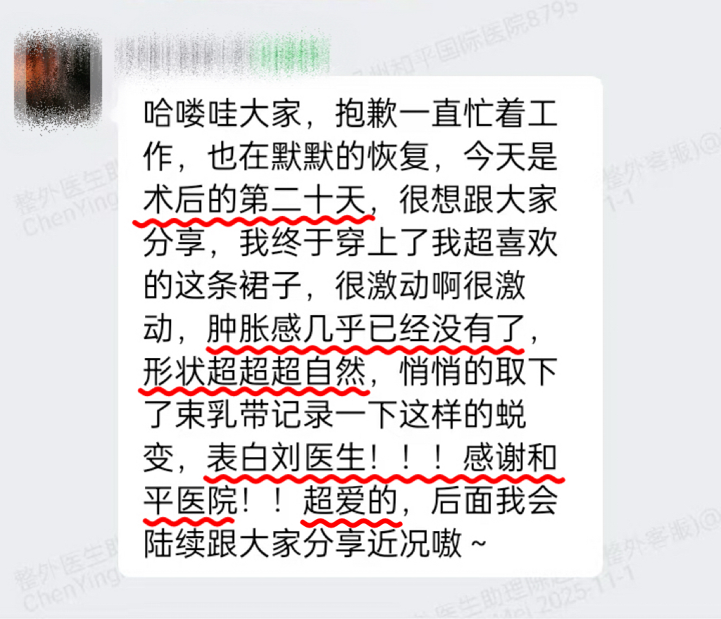 近日,和平國際醫(yī)院整形外科主任劉斌團(tuán)隊(duì),收到了可視化豐胸手術(shù)親歷者李女士發(fā)來的術(shù)后反饋,這份暖心分享,記錄了她術(shù)后20天的切身感受。
