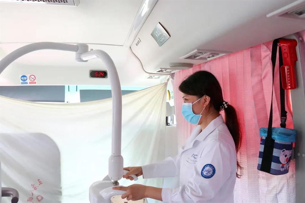 一大早,乳腺癌移動(dòng)篩查車就緩緩駛?cè)胄?nèi),不少患者早已等候在等待區(qū)。車上分為乳腺B超診察區(qū)域、乳腺超聲診斷系統(tǒng)Abus機(jī)操作區(qū)域以及候診區(qū)域,并配有專業(yè)的醫(yī)護(hù)人員進(jìn)行檢查。 乳腺健康移動(dòng)篩查車駛?cè)胄@